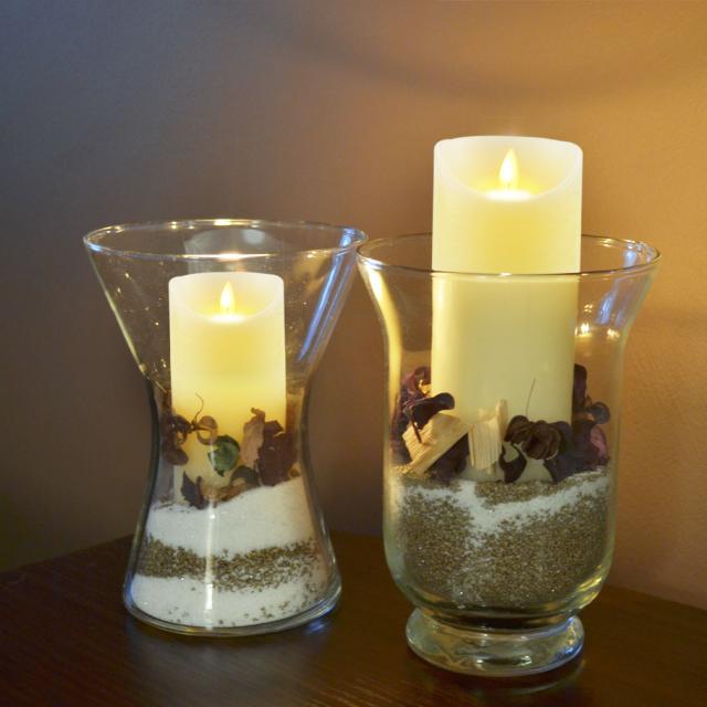 LEDで再現した火なので、触ったり倒してしまっても大丈夫。小さなお子さまやペットがいるご家庭でも安心サイズ : L:直径8cm×高さ15cm、M : 直径8cm×高さ13cm、S: 直径8cm×高さ10.5cm; 総重量:800g