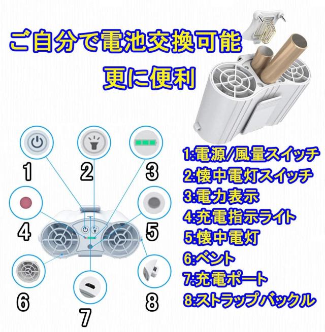 【3階段風量調節&切替方法&照明可能】風力が弱/中/強の3段階。切替電源ボタンを押すたびに風量は弱、中、強、オフの順番で変換できます。使用中電源ボタンを3秒以上長押すとオフになります。夏日の熱さによって、いつでも風の強さをご調節使用できます。懐中電灯機能付き、いつでもどこでも照明可能。