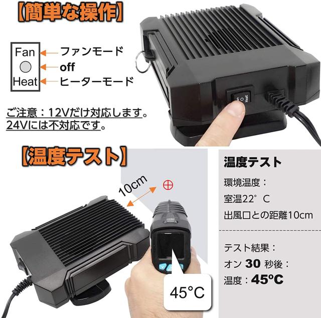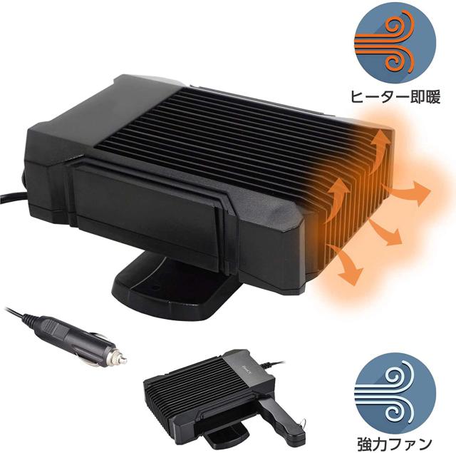 【取付カンタン、360°回転可能 】お好みの位置にヒーターを固定し、シガーソケットにアダプターを差し込むだけで設置完了。本体は360°回転可能、上下にもお好みの角度に調整できます。【コンパクト&高性能】コンパクトサイズでダッシュボードに置いても運転時に視線が遮られません。またスイッチ1つでヒーターと送風に切替可能です。