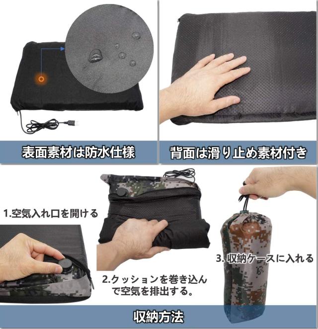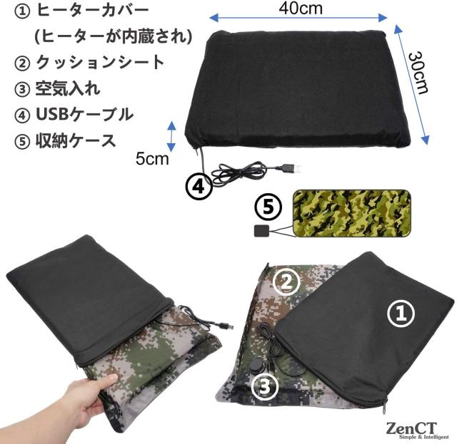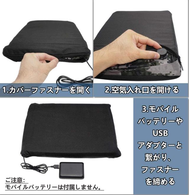 【使い・収納方法は簡単】設置簡単:空気入れ口を開けて、USB電源を入れるだけで即暖できます。収納方法:空気入れ口を開けて、クッションを巻き込んで空気を排出する。最後、蓋をしっかり閉めて、製品をケースに入れる。