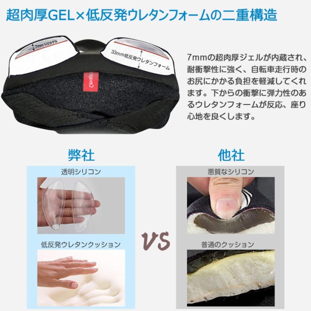 低反発ウレタンフォームと超肉厚ゲルの二重構造で、一般的なサドルカバーとの違いを実現しました。クッション性の高い低反発ウレタンを使用し、下からの振動や衝撃を十分に吸収しつつ変形しにくく、適当な硬さのあるゲルがお尻にかかる重量を分散させ痛みを軽減してくれ、乗り心地が高めます。