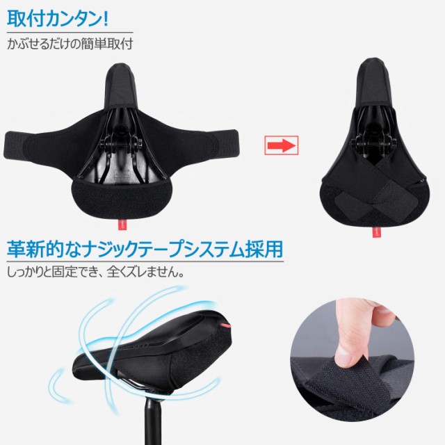 【最新なテープクロス縛りシステム】今までのドローコード式と違う左右交差のようなテープクロス式を採用。しっかり固定でき、全くズレない固定力を実現しました。 サドルとの密着性を高めるよう裏側全面に滑り止め加工されています。サドルとカバーの「ズレ」を軽滅させます。走行時の安定性がアップ!