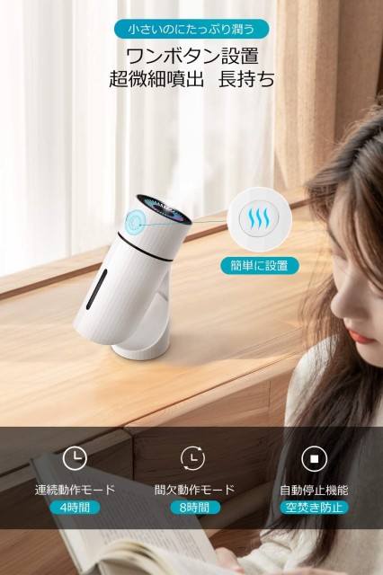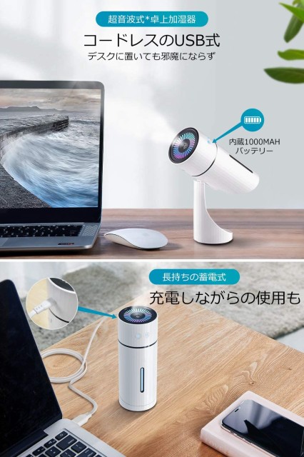 加湿器 卓上 USB充電式 車載加湿器 上から給水 七色LEDライト 水漏れしない 超音波加湿器 8時間連続加湿 空気清浄 空焚き防止