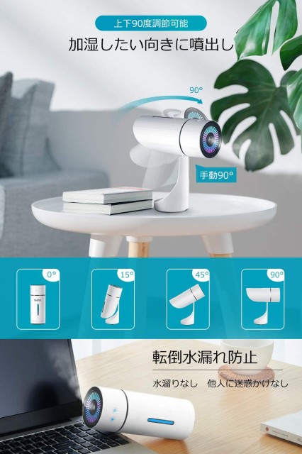本品は上下90度まで調整できる超音波加湿器です。本体を傾け、超音波振動により超微細ミストが加湿したい角度に吹出し、行き渡らないところにも潤いを届け、オフィスに最適な卓上加湿器です。仕事中に使う時もとなりの人に邪魔せず、マイデスクだけに向けて加湿することができます。暖房による空気の乾燥や、パソコンやタブレットの画面を長時間見つめている目の乾燥から守ります。しっかり密封設計により、90度まで傾いても水漏れせず、うっかり倒してしまっても水がこぼれることがないので、会社のデスク、書斎の机など、PC周りに置いても安心して使用できます。