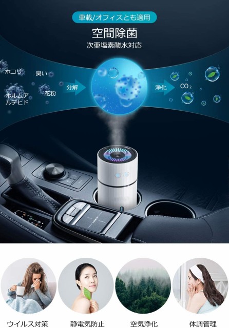 車のドリンクホルダーに収まる小型加湿器なので、車載用にもぴったりです。エアコンをかけていつもより乾燥しやすい冬場の車内を、たっぷりミスト加湿によって、ホコリの飛散を防ぎながら、密閉空間の車内の嫌な匂いを一掃し、車内の空気洗浄を助けてくれるミニ加湿器です。特に毎日車通勤などの方は、乾燥や花粉などの影響を少なく保てて、移動中にもラクラクの気持ちに!それに、薄めた次亜塩素酸水を入れることも可能です。で、次亜塩素酸水を入れる際、必ず次亜塩素酸水の日本使用基準を参考してください。