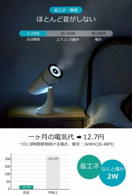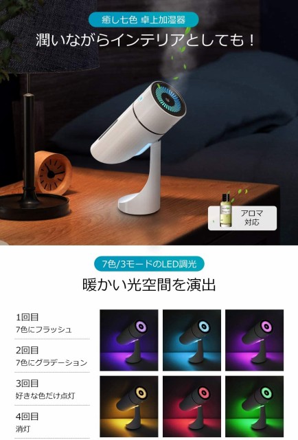 カラフルなLEDライト搭載された卓上加湿器は、気分に合わせて七色にフラッシュにしたり、カラー【8時間連続動作可能 静音加湿器】