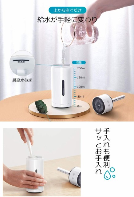 タンク容量は260ml、蓋を開けるだけで上から給水でき、手間をかからないとても便利な卓上加湿器です。スケルトン水位計により水の残りが一目で分かります。お掃除も簡単なため、加湿器のお手入れが苦手な方にもおすすめです。(※給水芯を定期的に交換必要です。) 【仕様】