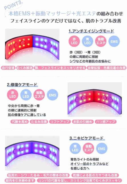 シワなどの年齢肌のお悩みに。修復ケアモードはフィスリフトアップ、むくみ改善、お肌の引締め、ハリ感アップ。肌の修復ケアに適しています。ニキビケアモードは肌荒れ*シワ*ニキビ?毛穴の開きの他、乾燥による肌のカサつきの改善が期待できます。各モードで5つの段階があり、肌の状態により、リモコンで強弱が調整できます。