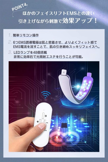 効果:肌荒れ?シワ?ニキビ?毛穴の開きの他、乾燥による肌のカサつきの改善 振動エステ 適度な振動で美容液やジェルを素早く皮膚の奥深くに浸透させます。また、血行をよくして肌細胞を活性化させます。 頻率:3.5kHz 使用頻度:週3回まで 6つEMS誘導電極で効果的にリフトアップ 金属のEMS誘導電極は6つまで付き、肌との接続がよりよく密着させ、EMS電流はEMS誘導電極でしっかり微弱電流を流れます。使用の時に、美容液や乳液などをEMS誘導電極で塗り、微弱電流で肌への浸透率もアップさせます。 無線リモコンで簡単操作 リモコンが付き、「+」「−」ボタンを押すことでEMSの強さ(五段階)が調節られます。「MODE」ボタンを押し3種類モードの切替も操作簡単だし利便性が満載します。自動タイマー機能があり、ケア時間は10分経過すれば自動的に電源が切れます。電源のオフことは心配しなくなり、より安心にフェイスケアへ。