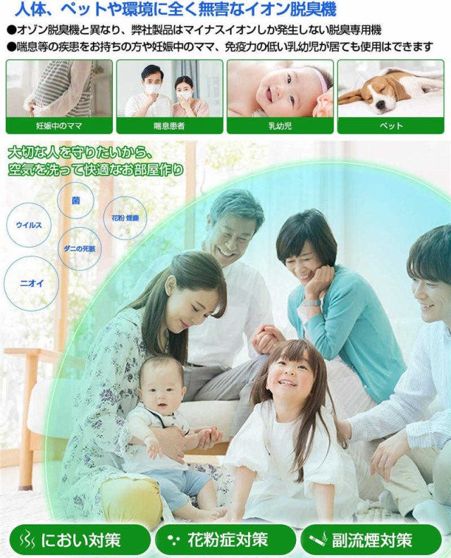 ●有人空間での使用が勧めないオゾン脱臭機と異なり、人体・動物・環境に無害なマイナスイオンしか発生しない脱臭専用機で、喘息等の疾患をお持ちの方や免疫力の低い乳幼児が居ても使用はできます。