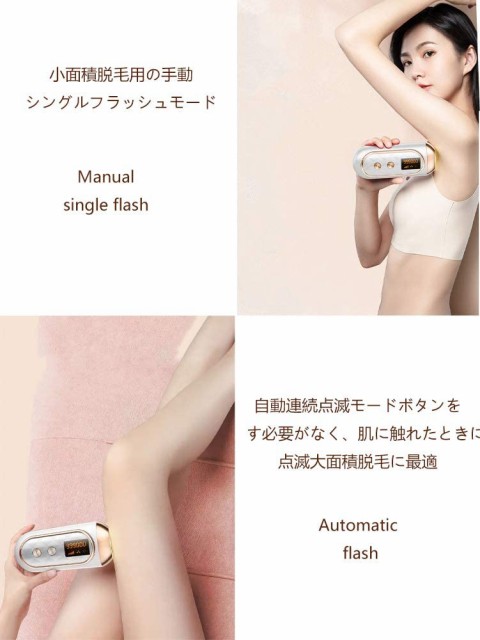 【全身使用】光脱毛機器、が広く使用され、多機能。IPL光美容は、脱毛だけではなく美肌効果も実感できます。これ1台で全身の光美容が可能なIPL光美容器(光脱毛器)です。二つのモードは自由に切り替わります。手?モードは小?域の脱毛に?しています。例えば、脇、鼻の下、ビキニライン、指などです。自動モードは足や腕などの広いところで脱毛できます。目やおでこの周りでは使わないでください。