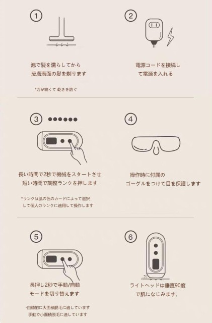 パッケージ内容:光脱毛機器X1、サングラスX1、カミソリX1、アダプターX1