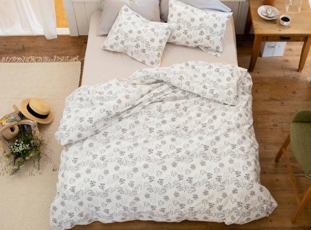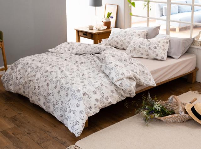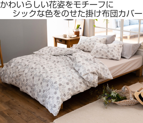 肌触りの良い綿100%の生地に、繊細でかわいらしい花姿をプリントした掛け布団カバーです。かわいらしい印象をもつ花柄モチーフですが、ホワイトベースにモノトーンのカラーをのせることでシックで上品な雰囲気に仕上がっています。