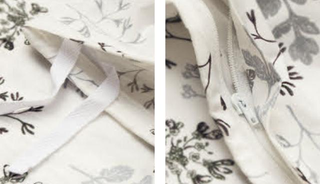 | ズレ防止のヒモ付き カバーの中でお布団がズレないように、内側にヒモが付いています。 (四隅+各中央 計8ヶ所) | 全開サイドファスナー仕様 お布団の出し入れが簡単に行える、片側が全開するサイドファスナーを採用。見返し付きでファスナーが肌に直接触れにくい仕様になっています。 |