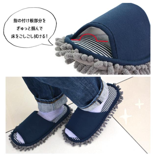 指の付け根の突起を足でぎゅっと掴んで拭けるモップスリッパ。