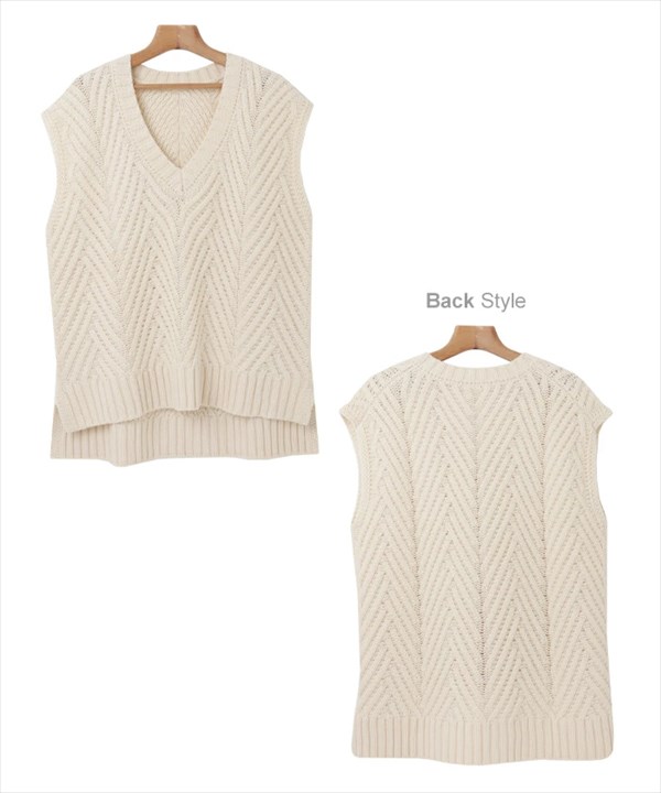 ニットベスト レディース ロング ヘリンボーン柄 深Vネック ヘリンボーン ニット ざっくりニット ざっくり ウールライク 凹凸感 体型カバー 軽やか質感 楽ちん ゆったり tops knit ホワイト 白 ブラウン グレー ブラウン