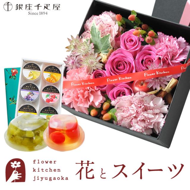 花とスイーツのセット♪ 四角BOXLサイズアレンジメント+【銀座千疋屋】銀座ゼリー6個入りセット プレゼント 誕生日 記念日 お祝い花 即日発送 あすつく メッセージカード FKAASW