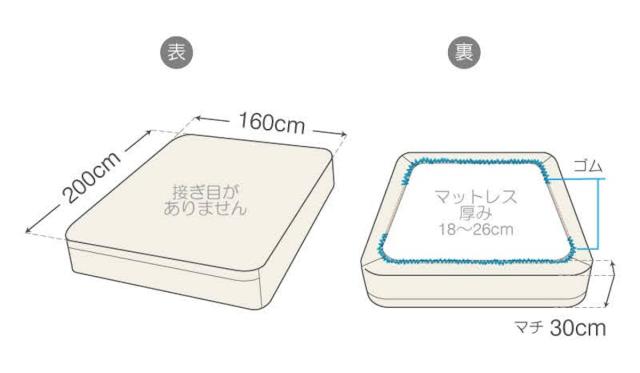 | マチ30cm マットレスの四隅をすっぽり包み込むようにあらかじめマチを30cmとっています。 ※厚み18〜26cmのマットレスに対応しています。 | 上下ゴム入り シーツの角をマットレスの角に引っ掛けるだけでフィットし、シーツが固定されるため寝返りをうってもずれにくくなっています。 |