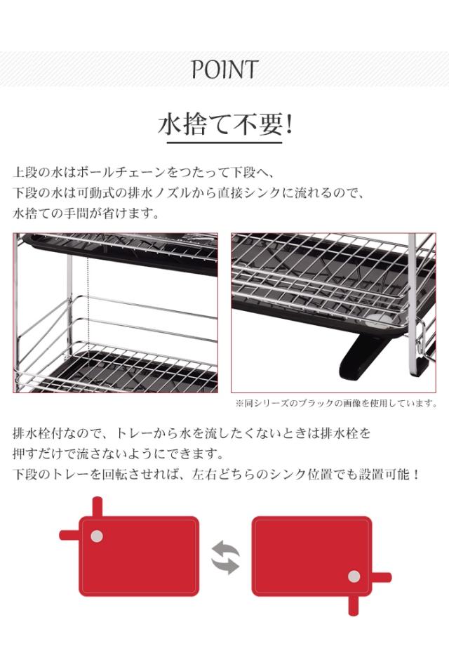 | 水捨て不要のたっぷり収納できる2段式水切りラック。 お皿を立てて置けるので水切れ抜群。 上段の水はボールチェーンをつたって下段へ、下段の水は可動式の排水ノズルから直接シンクに流れるので、水捨ての手間が省けます。 排水栓付なので、トレーから水を流したくないときは排水栓を押すだけでOK。 下段のトレーを回転させれば、左右どちらのシンク位置でも設置可能です。 水受けトレーはスライド式で取り外せるのでお手入れラクラク。 スプーンや箸を立てて水切りできる水切りポケット、まな板も収納できるまな板受け付き。 防サビ加工付き。 スタイリッシュなフォルムとカラーアクセントでキッチンを明るい印象に。 |