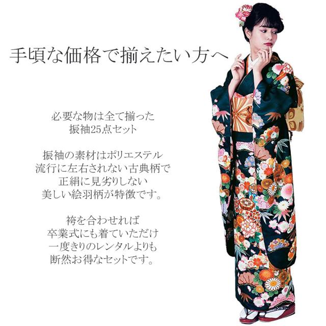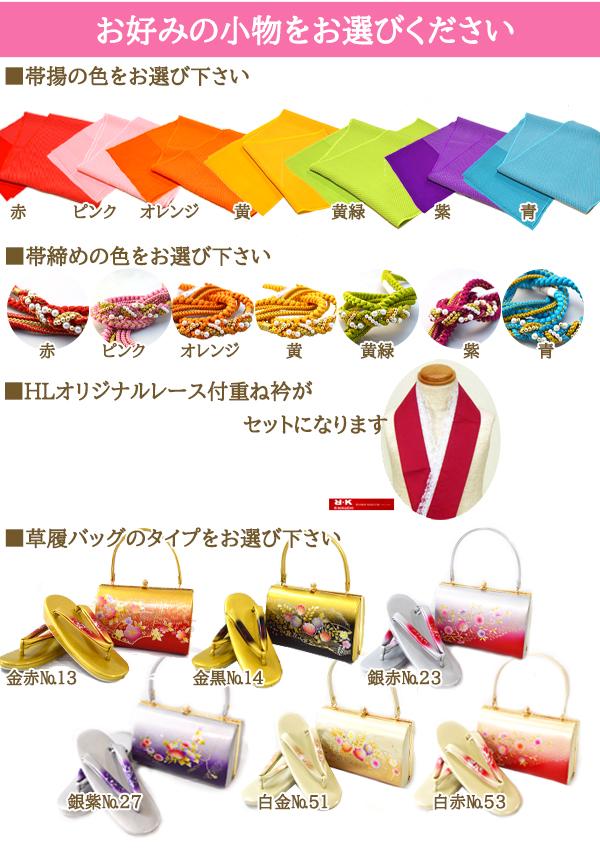 振袖・袋帯・長襦袢・半衿・重ね衿・帯締・帯揚・草履・バッグ・腰紐6本・伊達締め2本・帯板・帯枕・衿芯・三重仮紐・後板・着物ベルト・着物スリップ・足袋