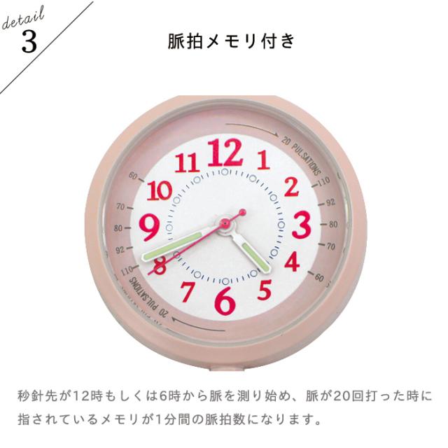 秒針先が12時もしくは6時から脈を測り始め、脈が20回打った時に指されているメモリが1分間の脈拍数になります。