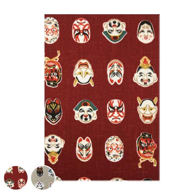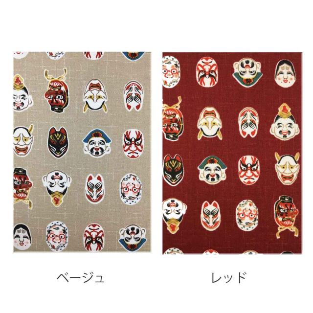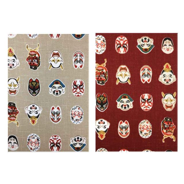 お面柄の御朱印帳です。表紙は日本製の生地で作られています。デザインは、ベージュとレッドの2種類からお選びいただけます。