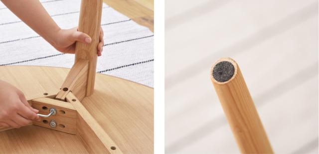| 簡単な組立て 脚を付けるだけの簡単な組立てです。 | 脚裏にクッション付き 脚裏にクッションが付いているので、床に傷が付きにくいです。 |
