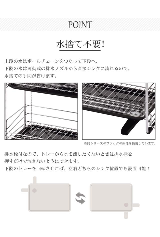| 水捨て不要のたっぷり収納できる2段式水切りラック。 お皿を立てて置けるので水切れ抜群。 上段の水はボールチェーンをつたって下段へ、下段の水は可動式の排水ノズルから直接シンクに流れるので、水捨ての手間が省けます。 排水栓付なので、トレーから水を流したくないときは排水栓を押すだけでOK。 下段のトレーを回転させれば、左右どちらのシンク位置でも設置可能です。 水受けトレーはスライド式で取り外せるのでお手入れラクラク。 スプーンや箸を立てて水切りできる水切りポケット、まな板も収納できるまな板受け付き。 防サビ加工付き。 スタイリッシュなフォルムとカラーアクセントでキッチンを明るい印象に。 |