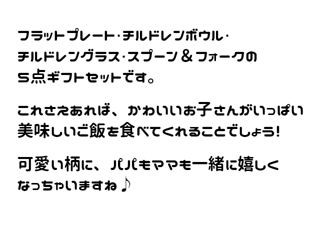 フラットプレート・チルドレンボウル・チルドレングラス・スプーン&フォークの5点ギフトセットです。 |