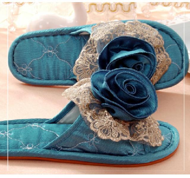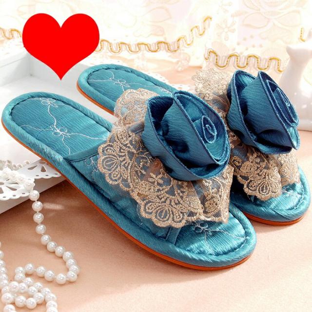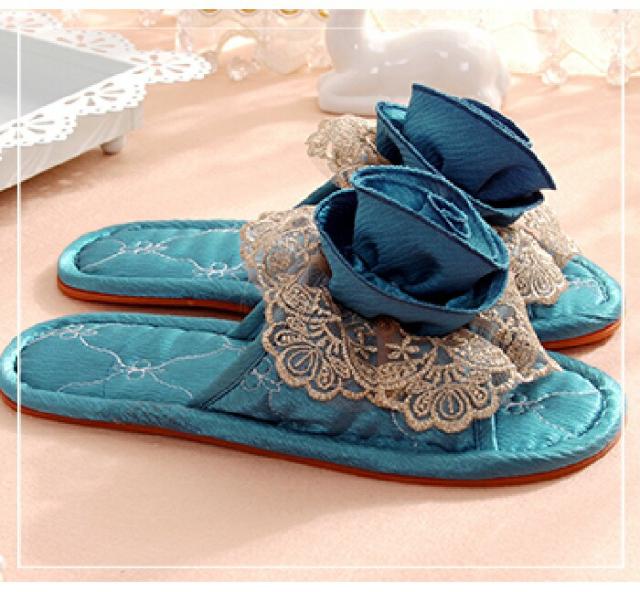 ルームシューズ サンダ ルスリッパ 送料無料 スリッパ レディース 室内履き 上履き 婦人 四季 刺繍 レース リボン かわいい 可愛い 高級 女性 来客用 22〜23/23〜24cm ブルー 滑り止め 柔らかい