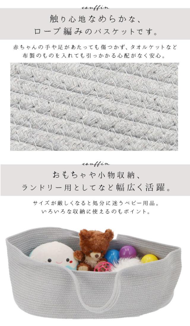 | 商品説明 | ・赤ちゃんがゆっくりお休みできる♪ベビーバスケットが発売。 ・触り心地なめらかなロープ編みのバスケット。赤ちゃんの手や足があたっても傷つかず、タオルケットなど布製のものを入れても引っかかる心配がないから安心。 ・使わない時は折りたたんで、コンパクトに収納可能。持ち手付きで、持ち運びもラクラク。 ・ベビー用のクーファンとしてだけでなく、お子さまのおもちゃや小物収納、ランドリーバスケットとしてなど幅広く活躍。 ・シンプルなデザインに、インテリアの邪魔をしないベーシックカラーをラインナップ♪ |