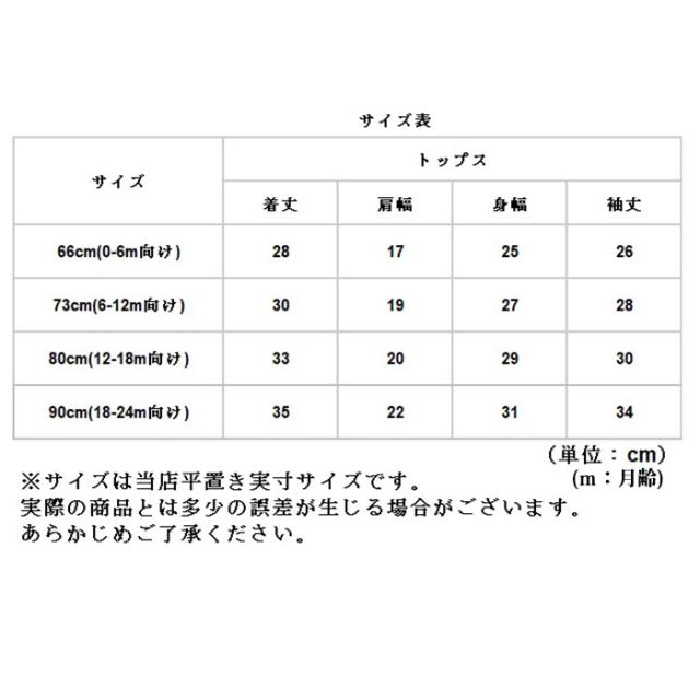 | サイズ | [キッズ] ・66cm(0−6m向け) ・73cm(6−12m向け) ・80cm(12−18m向け) ・90cm(18−24m向け) ※サイズについて詳細は、サイズ表をご覧くださいませ。 ※「m」は月齢を意味しています。 |