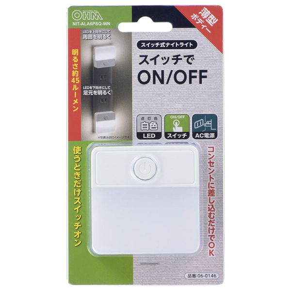 オーム電機 LEDナイトライト NIT−ALA6PSQ−WN オーム電機 LED照明 ナイトライト コンセントライト 廊下灯 足元ライト 補助照明 スイッチ コンセント 薄型 フットライト