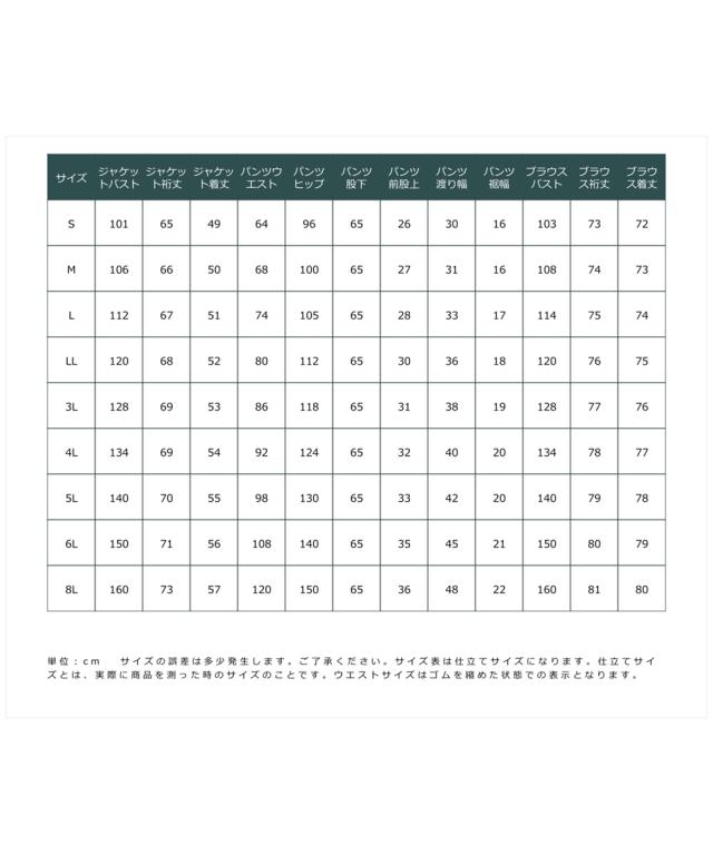 品質=[表地]ジャケット:ポリエステル100% パンツ:ポリエステル100% ブラウス:ポリエステル90%・ポリウレタン10% 【裏地】有(ジャケット:総裏 パンツ、ブラウス:無) ジャケット:肩パッド無 前スナップ開 ブラウス:前ボタン開 袖口ボタン開パンツ:前ファスナー内ボタン付ホック開 ウエスト後ゴム入 ポケット前2・後飾り コサージュ付 ※コサージュは取り外しできます。※この商品は3点同サイズのみで販売します。※コサージュは取り外しできます。 原産国:中国製 洗濯表示:洗濯機OK(ネット使用)