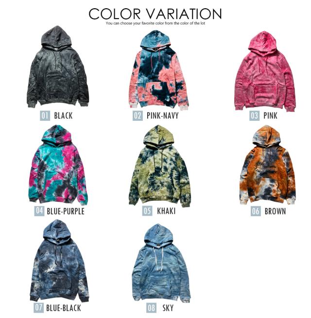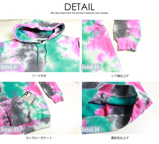 | カラフルなタイダイ柄たおしゃれなフードパーカー 存在感があるのでシンプルなパンツと合わせたりダンスで使ってもとってもかっこいい仕上がりになっています。! サイズも4サイズございますので、お好みに合わせてお選びいただけます! | |