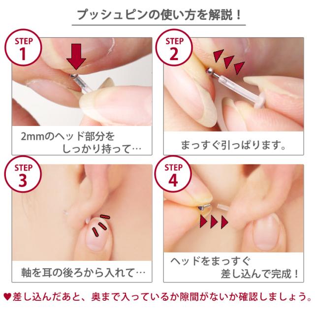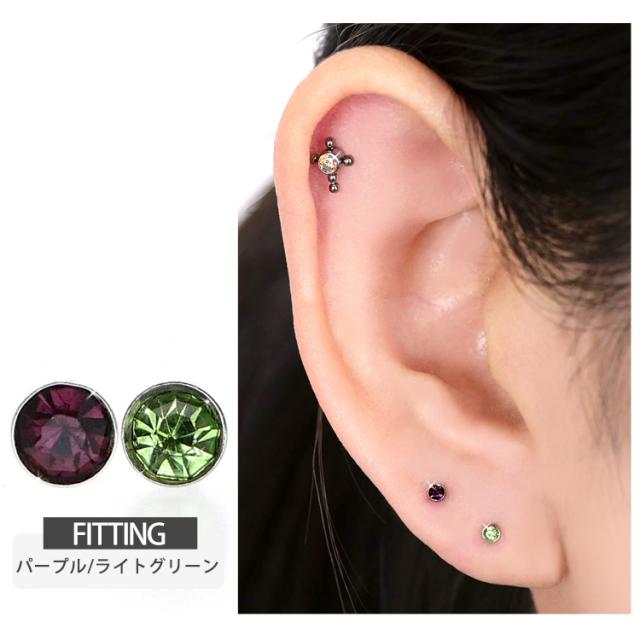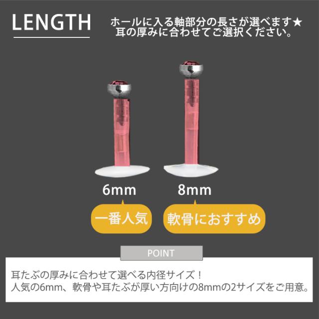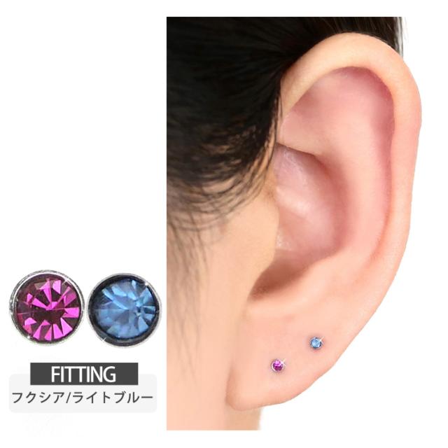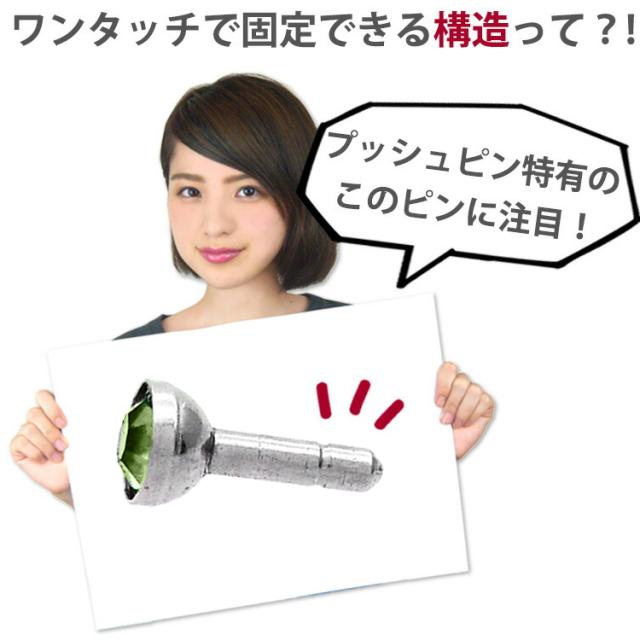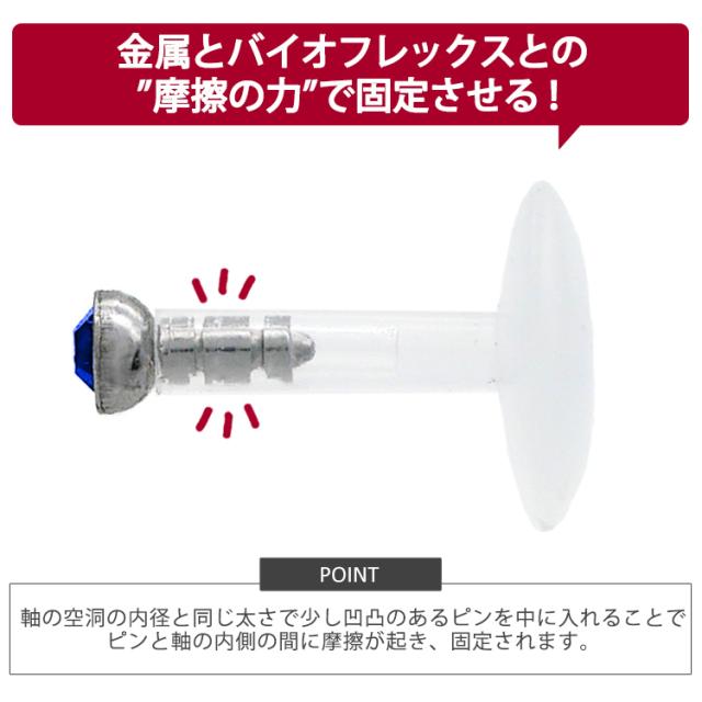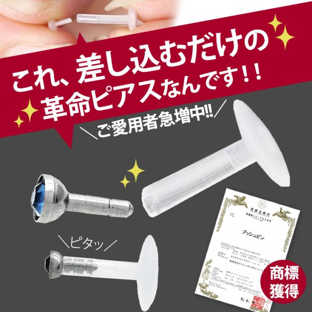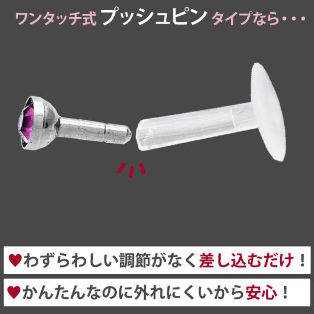 シンプルなベゼルセットジュエルのプッシュピンピアス。トラガスのような狭い部位や、ネジタイプが苦手な方には特にお勧めです。ヘッド部分から伸びるピンを軸に差し込めば装着完了です。ネジが無いので、知らない間に緩んできて失くしてしまった、そんな悩みからも開放されます。