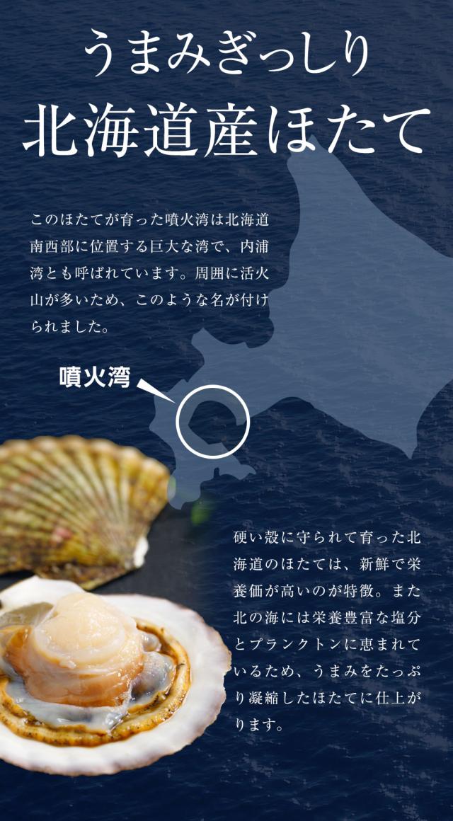 硬い殻に守られて育った北海道のほたては、新鮮で栄養価が高いことが特徴です。また北の海は栄養豊富な塩分とプランクトンに恵まれているため、うまみをたっぷり凝縮したほたてに仕上がります。