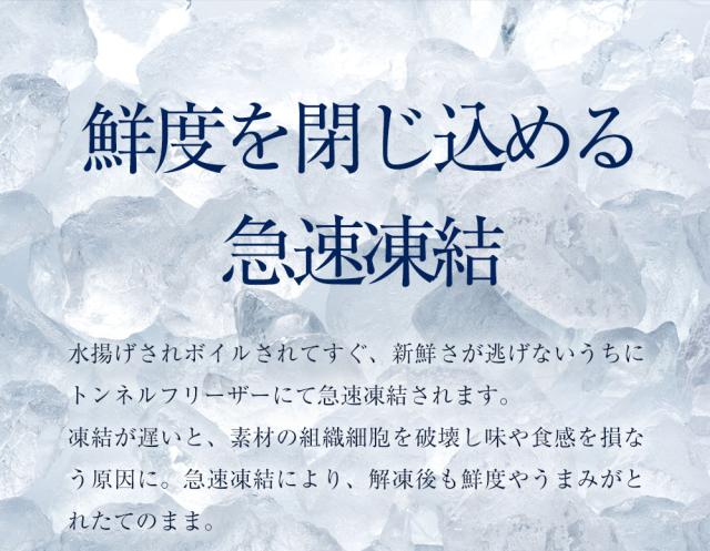 水揚げ後ボイルしてからすぐに新鮮さが逃げないようにトンネルフリーザーにて急速凍結されます。凍結が遅いと素材の組織細胞を破壊し、味や触感を損なう原因になってしまいます。急速凍結により、解凍後も鮮度やうまみはとれたてのままです。