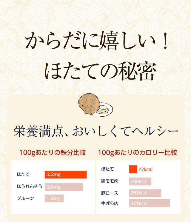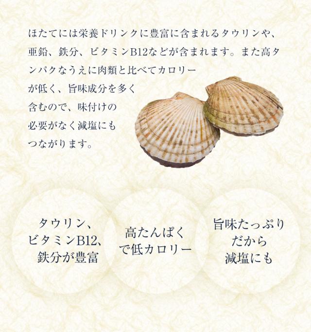 ほたてには栄養ドリンクに多く含まれるタウリンや、亜鉛、鉄分、ビタミンB12などが含まれています。高たんぱくなうえに肉類と比べてカロリーが低く、うまみ成分を多く含むので、味付けの必要がなく減塩にもつながります。