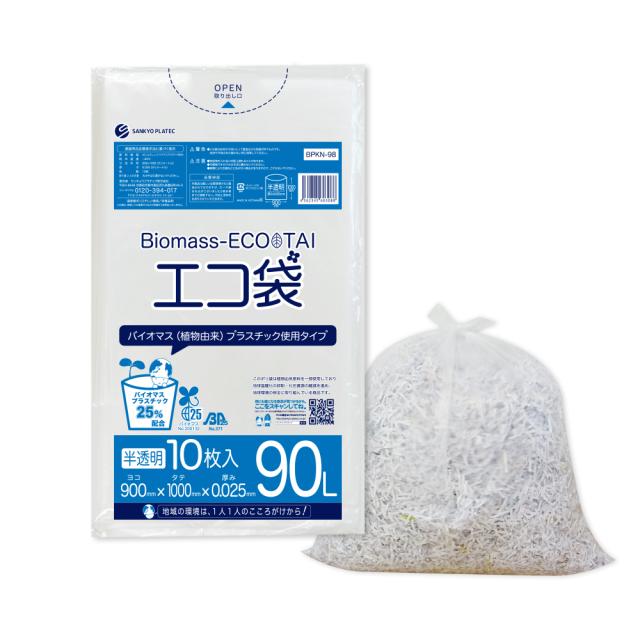 【バラ販売】BPKN-98bara バイオマスプラスチック25%配合エコ袋 90リットル 0.025mm厚 半透明 10枚 / ゴミ袋 ごみ袋