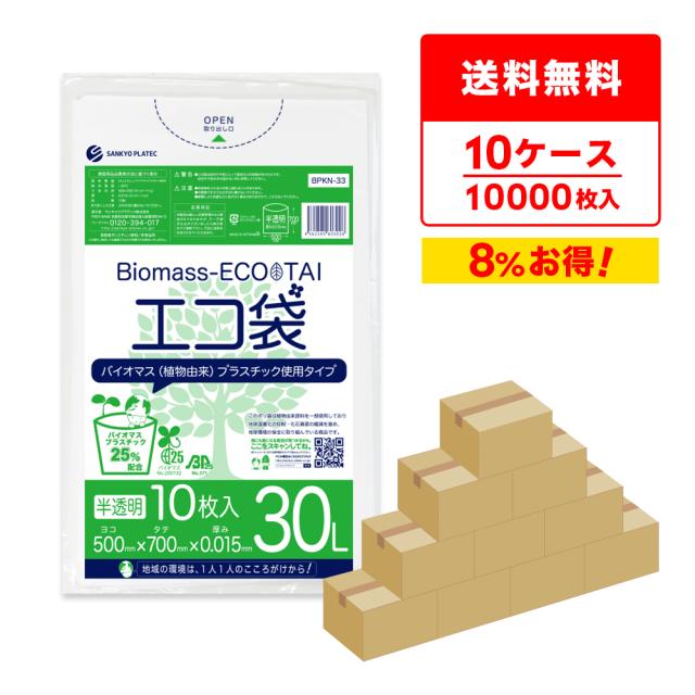 【まとめて10ケース】BPKN-33-10 バイオマスプラスチック25%配合エコ袋 30リットル 0.015mm厚 半透明 10枚x100冊x10箱 / ゴミ袋 ごみ袋 送料無料