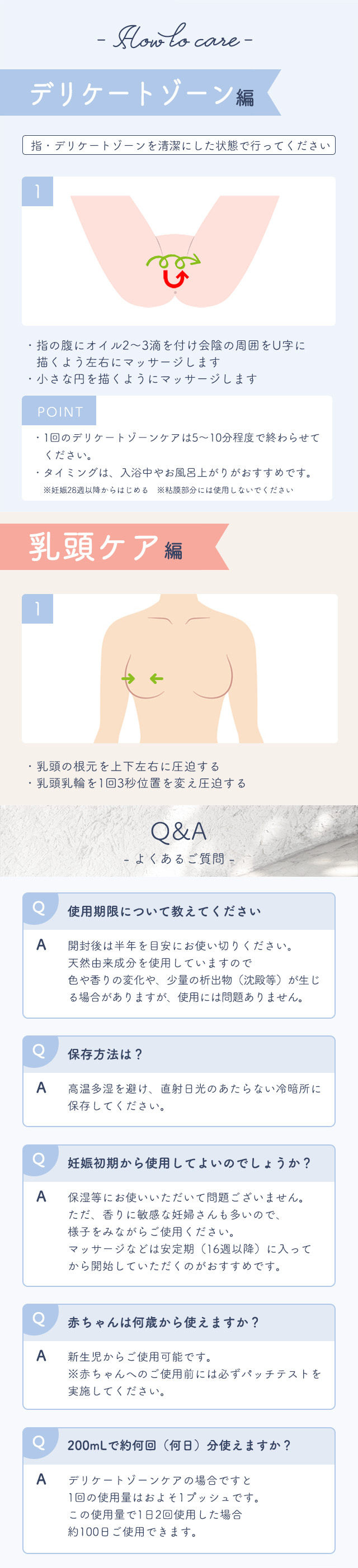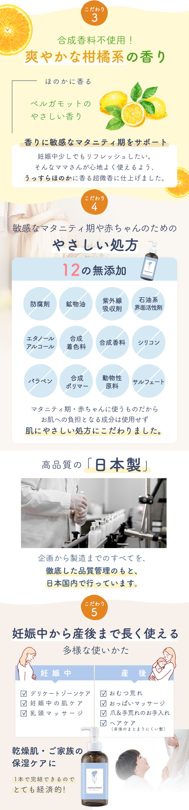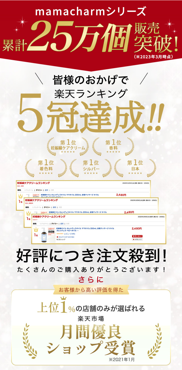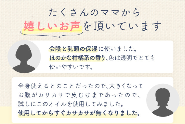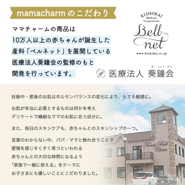 | 商品特徴 | 「妊娠線・肉割れケア」「会陰ケア」「赤ちゃんの保湿」など、産前・産後ケアがこれ1本で解決! |