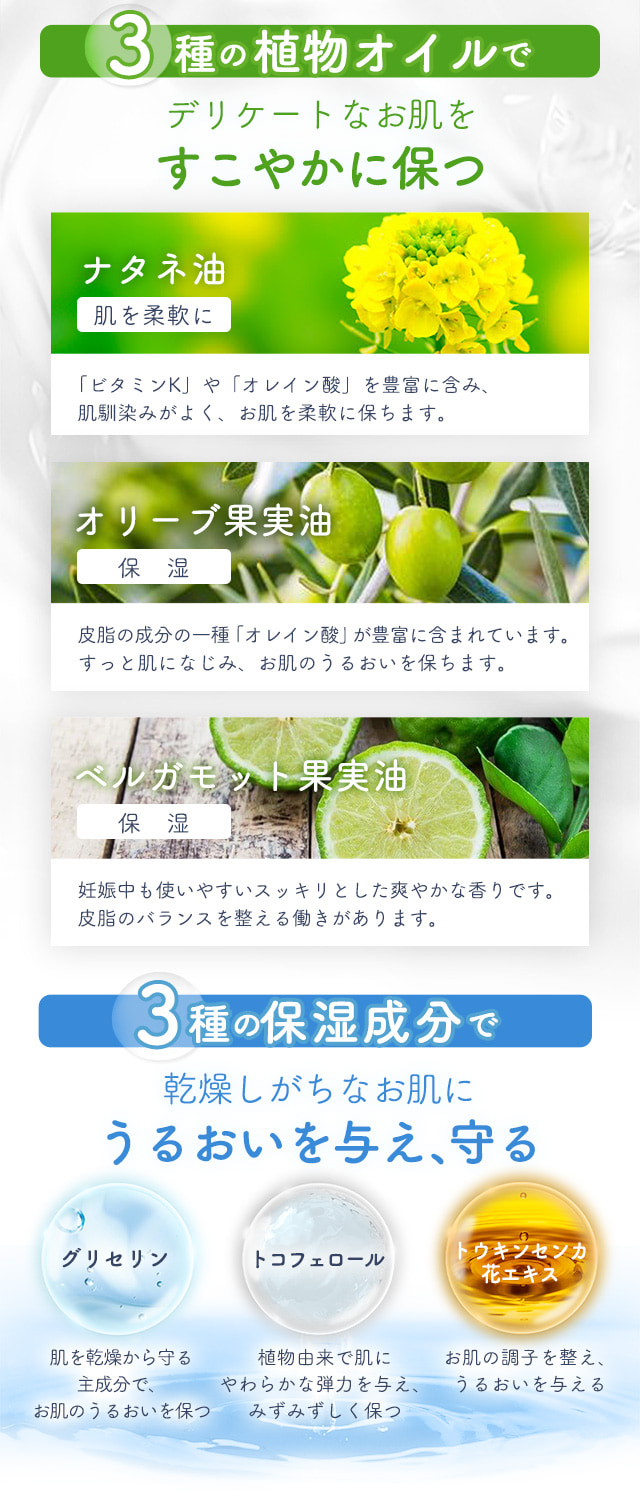 | 成分 | ナタネ油、オリーブ果実油、トウキンセンカ花エキス、グリセリン、トコフェロール、水、ベルガモット果実油 |