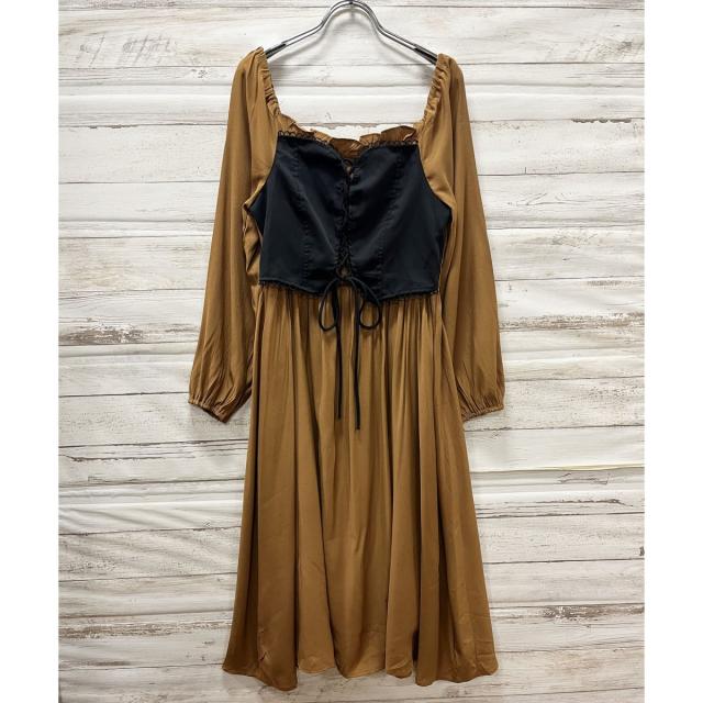 ☆コルセットを重ねたようなレディライクな一枚☆サテン素材のワンピースにコルセットを重ねたようなドッキング仕様のレイヤードワンピース♪編み上げ位置はお好きな位置で留めらえるので、シルエットの調節もできます♪胸元はフリルが覗くデザイン、袖はゴムギャザーでふんわりと仕上げ、フェミニンさをぎゅっと詰め込みました♪