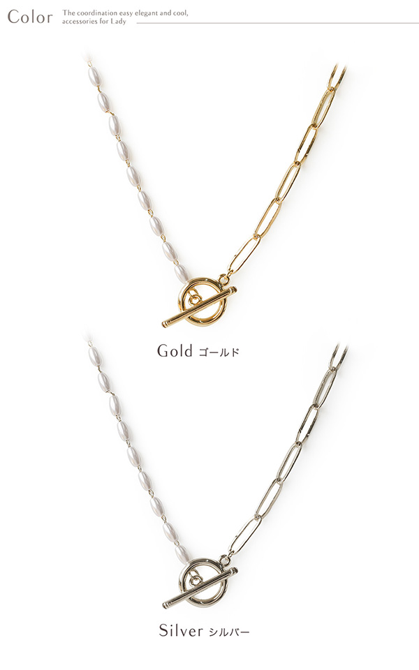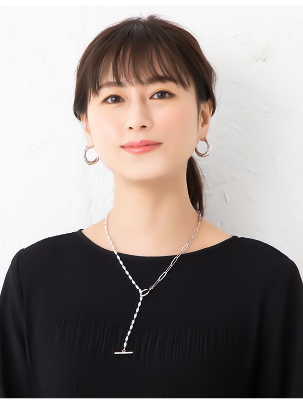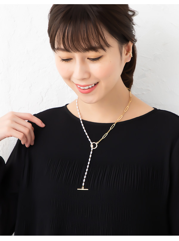 | 艶やかな楕円形のパールとチェーンを合わせたマンテル金具のネックレスです。 上品なパールとチェーンを合わせることで胸元にスタイリッシュな抜け感を演出 します。Y字にしたりマンテル部分を後ろに持って行ったりお好みで着けられるのもポイントです。 | |