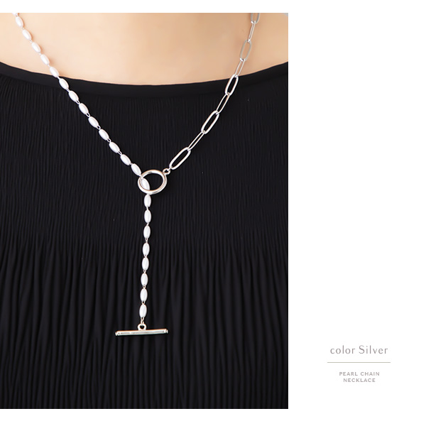 上品なパールとチェーンを合わせることで胸元にスタイリッシュな抜け感を演出