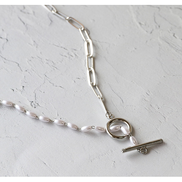 艶やかな楕円形のパールとチェーンを合わせたマンテル金具のネックレスです。