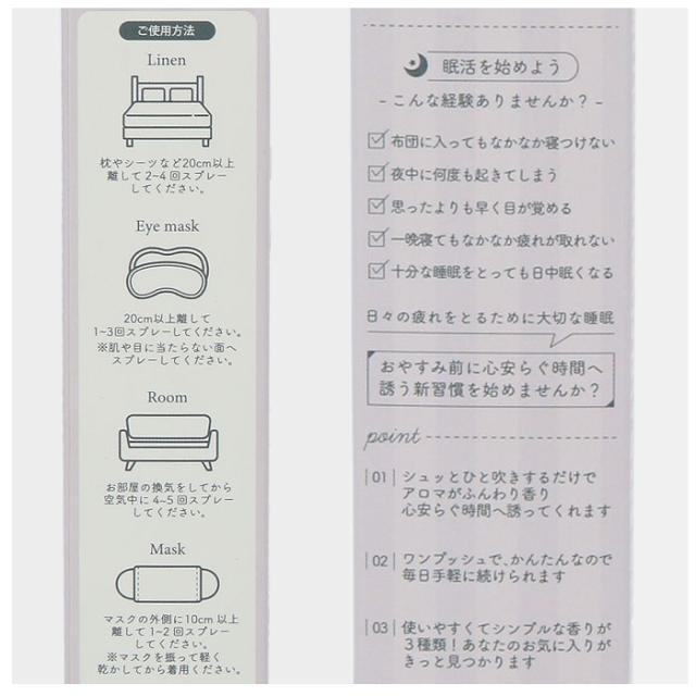 | 使用方法 | 【リネン】…枕やシーツなど20cm以上離して2〜4回スプレーしてください。 【アイマスク】…20cm以上離して1〜3回スプレーしてください。 ※肌や目に直接当たらない面へスプレーしてください。 【マスク】…マスクの外側に10cm以上離して1〜2回スプレーしてください。 ※マスクを振って軽く乾かしてから着用ください。 ※マスクを装着したままスプレーしないでください。 ※大量にスプレーすることはおやめください。 |