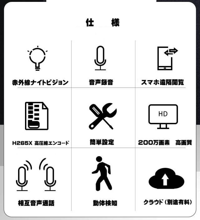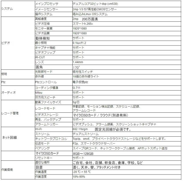 画質:1920*1080P 200万画素(フレームレート 〜30fps)