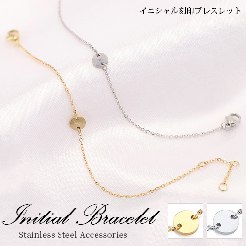 ブレスレット【aruon 名入れ工房】イニシャル コイン チェーン ブレスレット ステンレス イニシャル A~Z 2色 シルバー ゴールド チェーン ステンレスブレスレット 大人 刻印 おしゃれ 女性 かわいい アジスター付き 贈り物 記念日